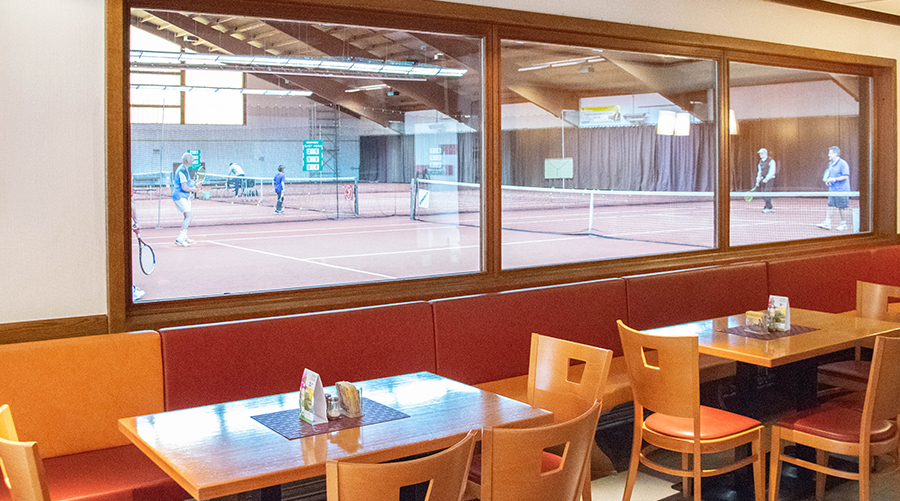 Durch das große Fenster könnt Ihr nebenbei Kollegen beim Spiel in der Halle beobachten. In der warmen Jahreszeit laden unsere Terrasse und ein großzügiger Außenbereich zum Verweilen ein.
