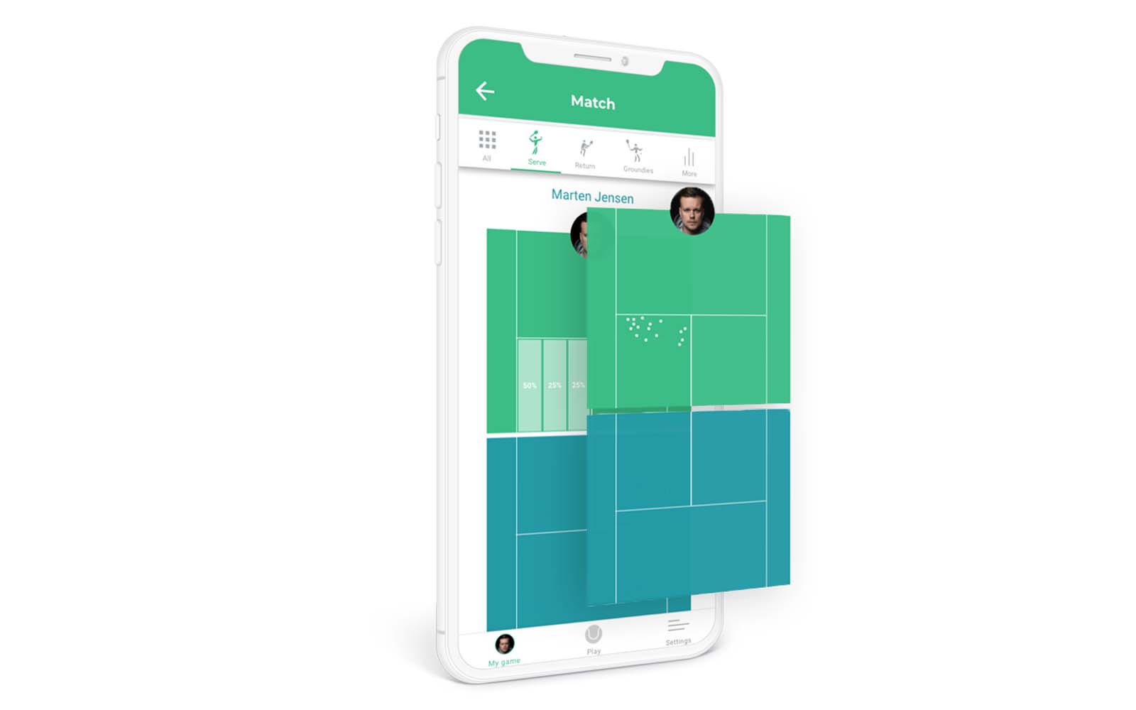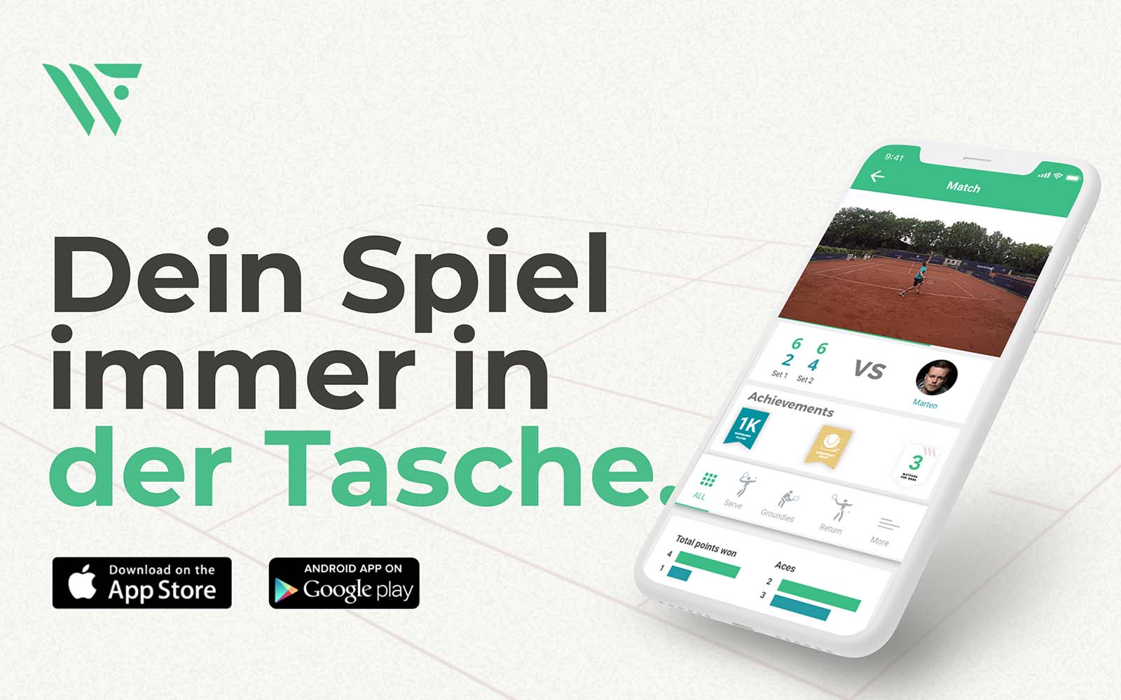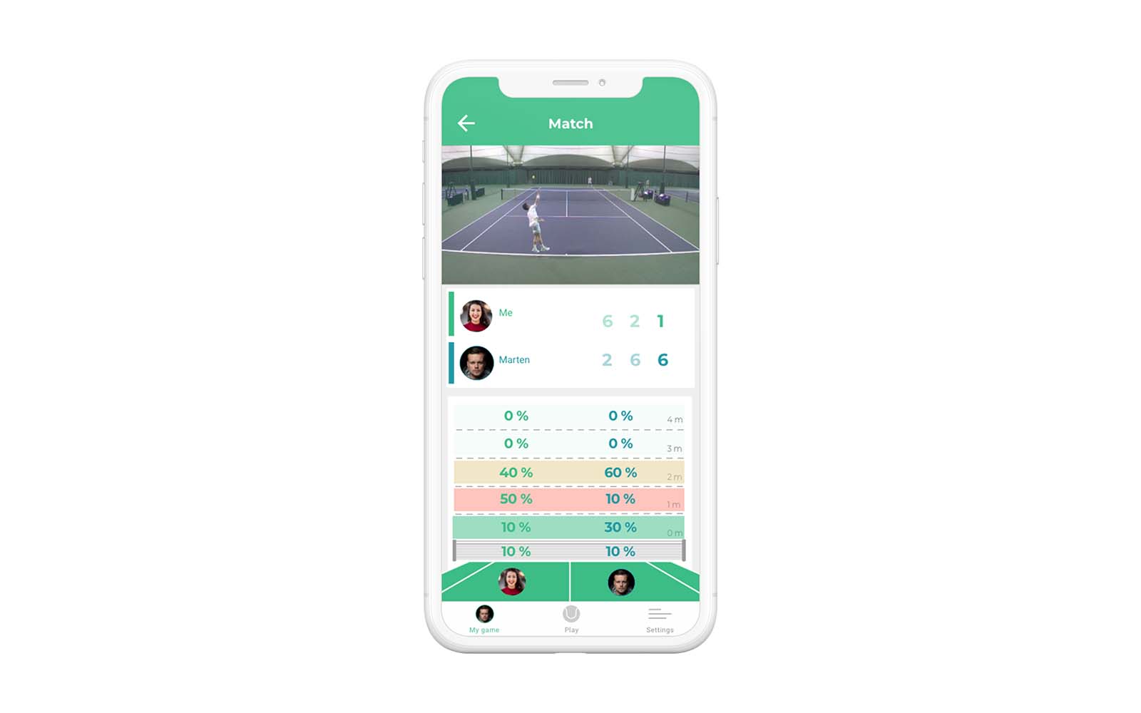 Am Ende deines Spiels erhälst du nicht nur eine komplette Statistik (Winner, Doppelfehler, Asse, Anzahl der Schläge, Platzierung, Geschwindigkeit….) sondern auch ein eigenes Video.